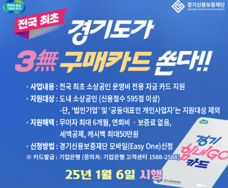 이 카드는 경기도 소상공인을 위해 특별히 설계된 운영비 지원 카드로, 무이자, 연회비 없음, 보증료 없음의 3무 혜택을 제공합니다.